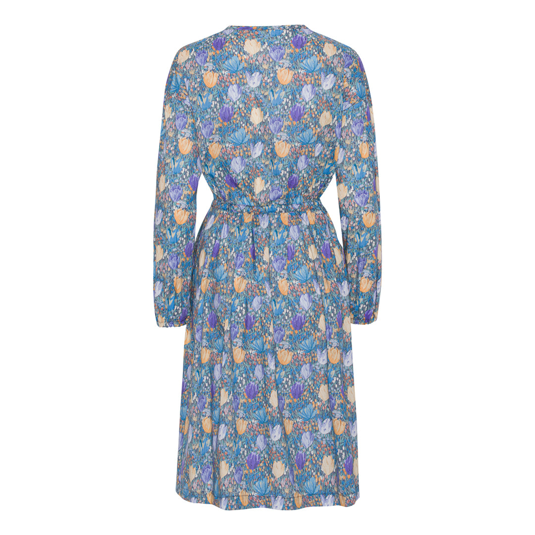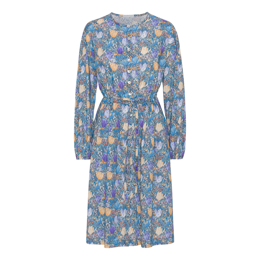 Manola kjole-Tulipan er syet i 100% bomuld i det smukkeste Liberty print. Der er perlemorsknapper ned foran, bindebånd i taljen og lommer i siden.