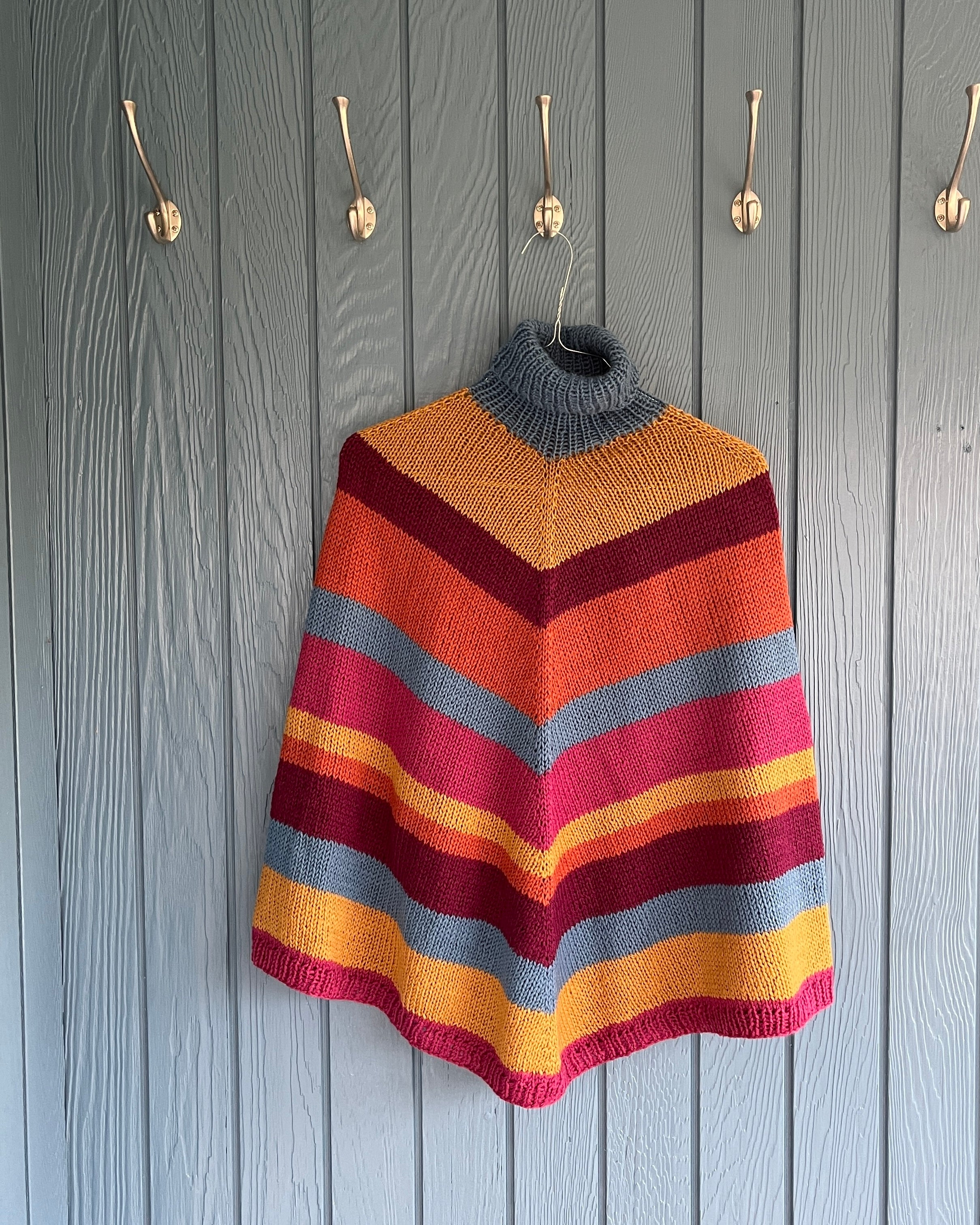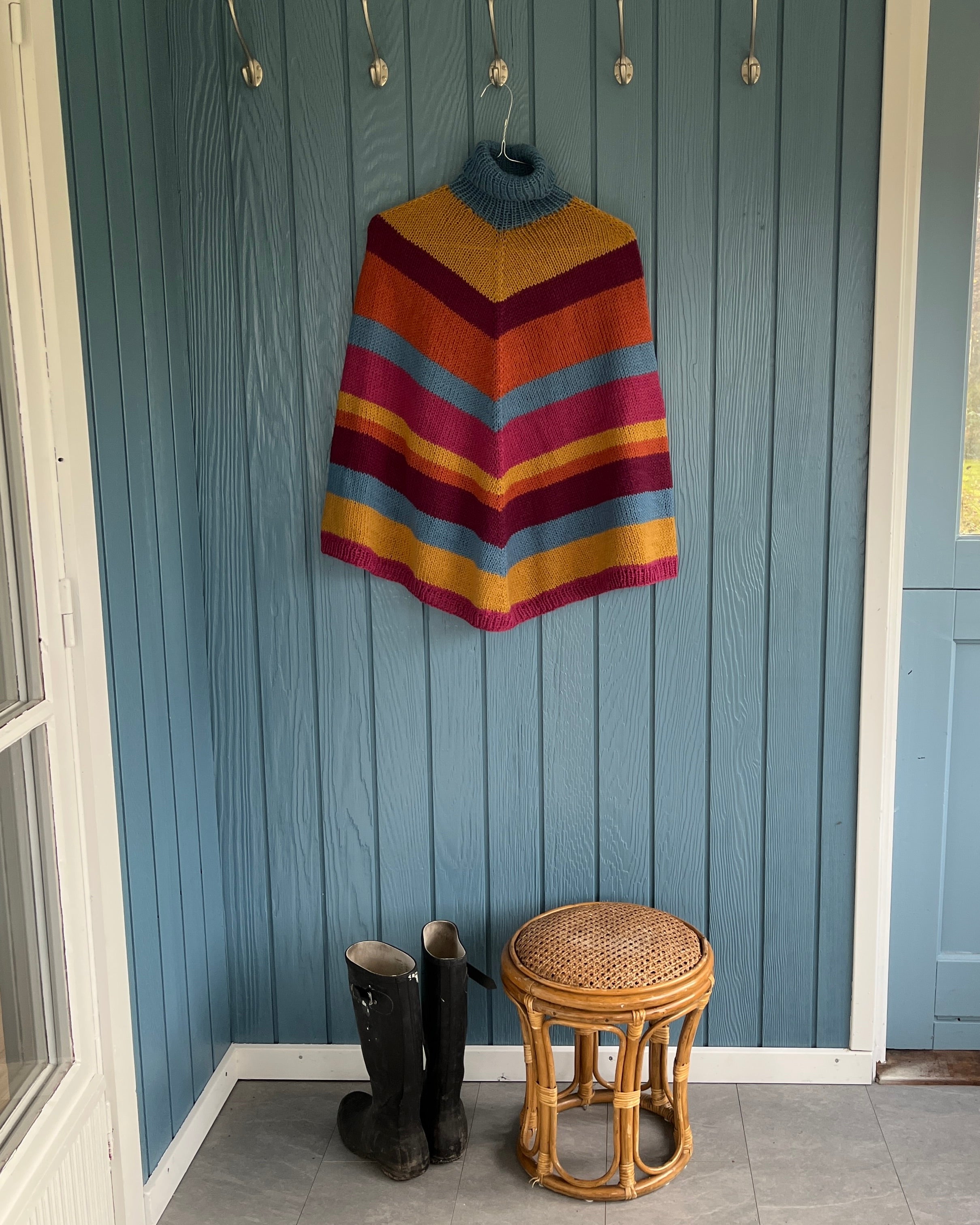 Denne poncho er strikket i blød merinould og fuld af farver, der gør selv grå dage lidt lunere.