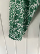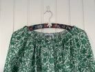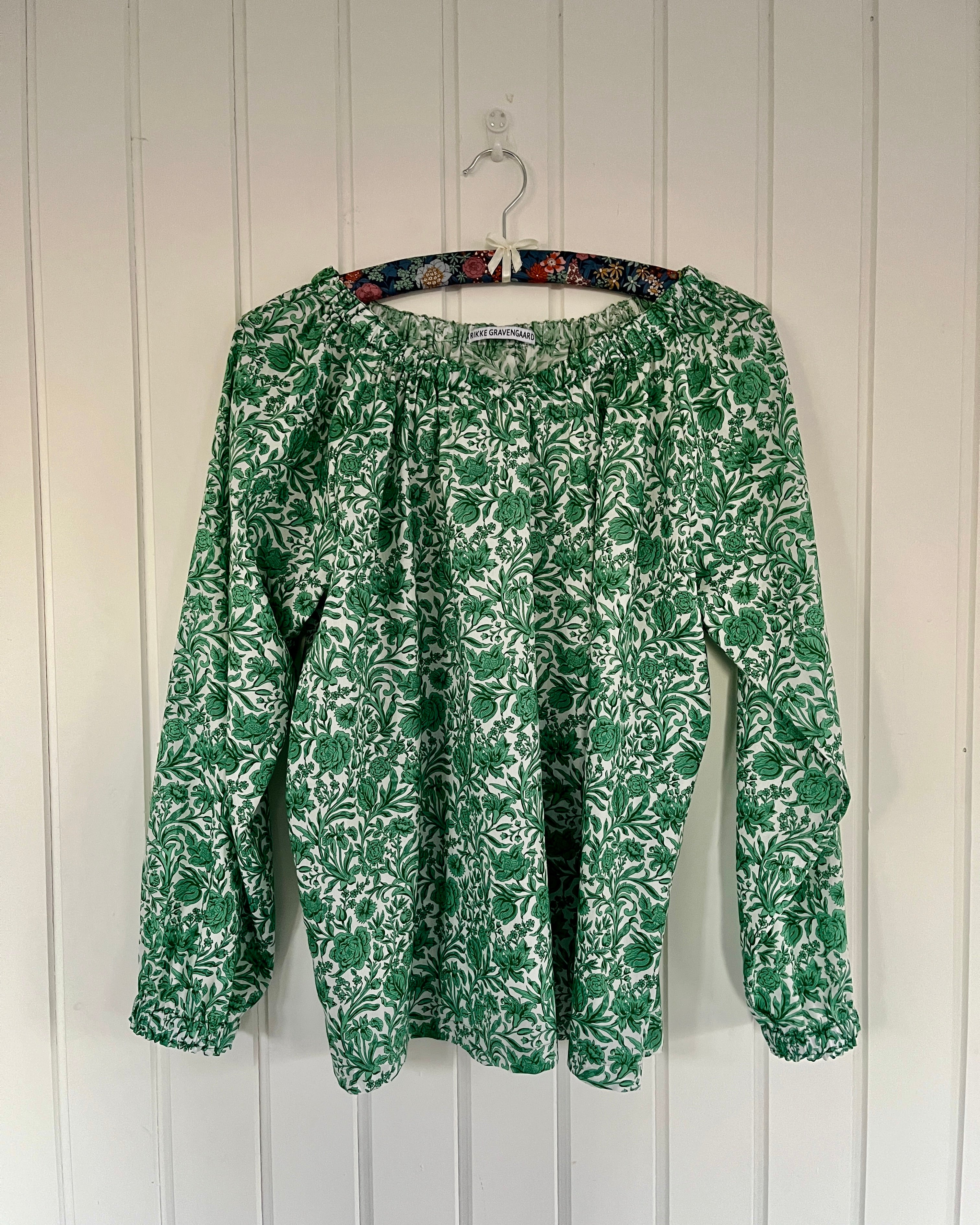 En smuk skjorte syet i 100% blød bomuld med det karakteristiske Liberty-print. Skjorten har elastik i både halsudskæring og ærmekant, hvilket giver en behagelig pasform og et let, feminint udtryk. Perfekt til både hverdag og særlige anledninger.