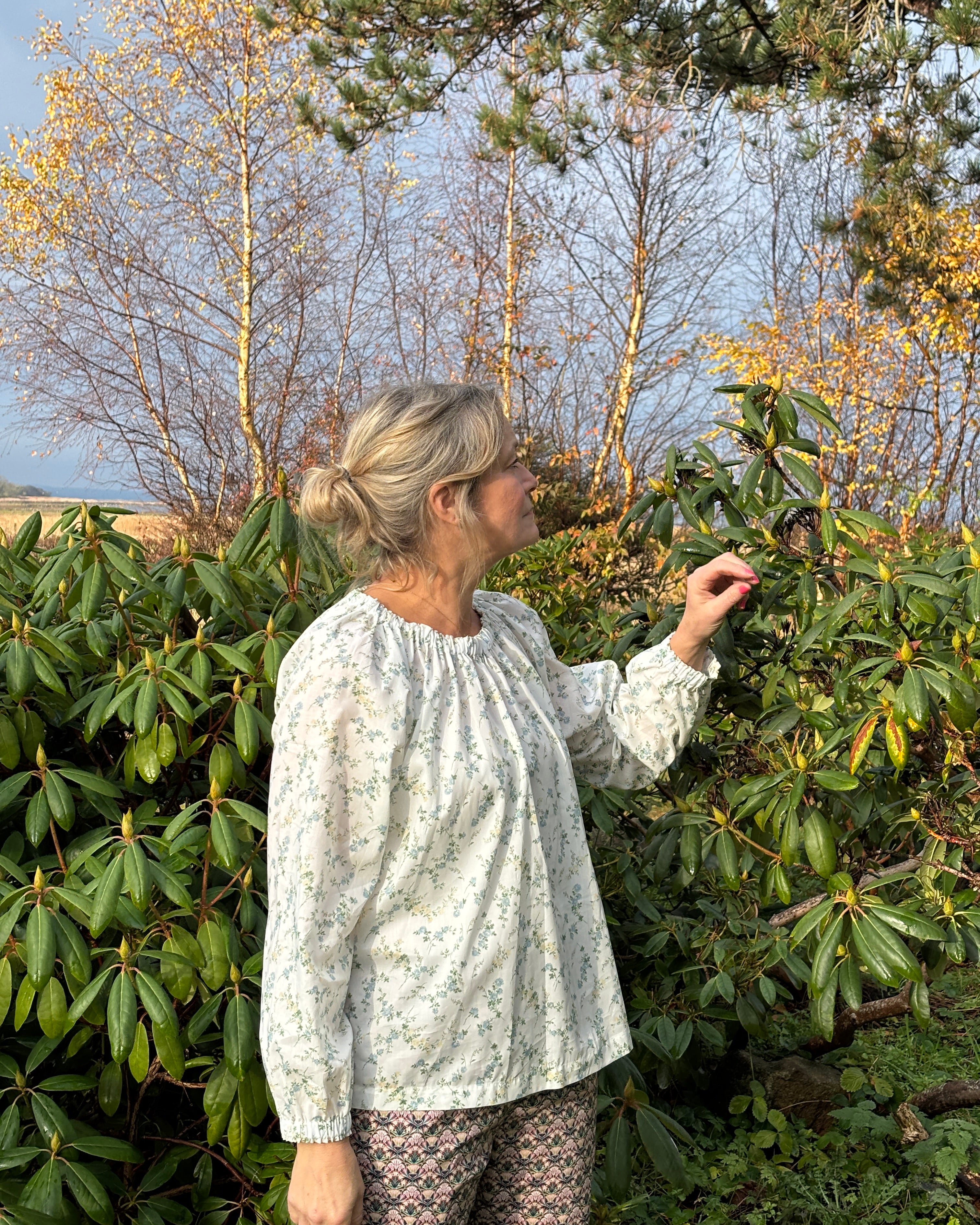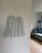 En smuk skjorte syet i 100% blød bomuld med det karakteristiske Liberty-print. Skjorten har elastik i både halsudskæring og ærmekant, hvilket giver en behagelig pasform og et let, feminint udtryk. Perfekt til både hverdag og særlige anledninger.