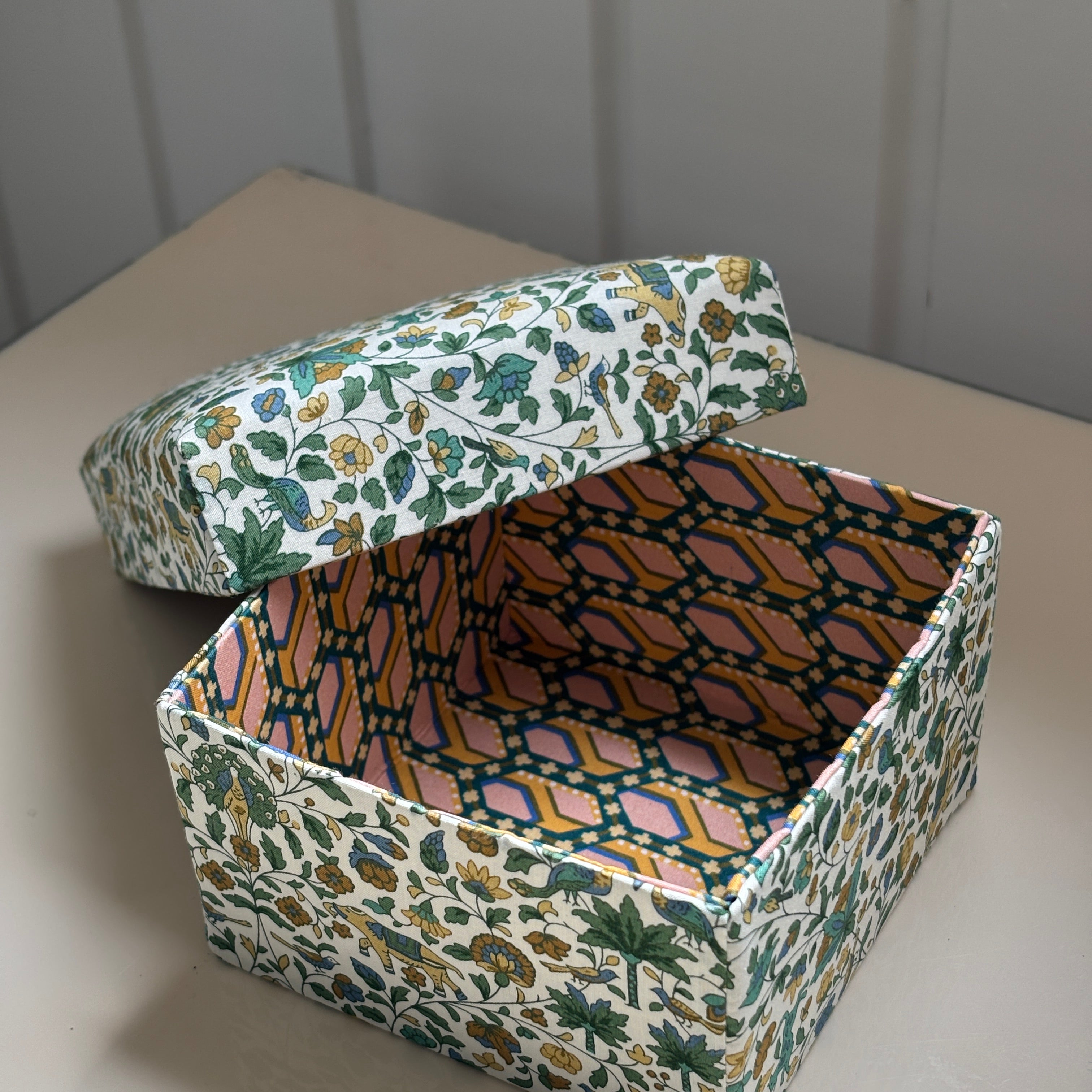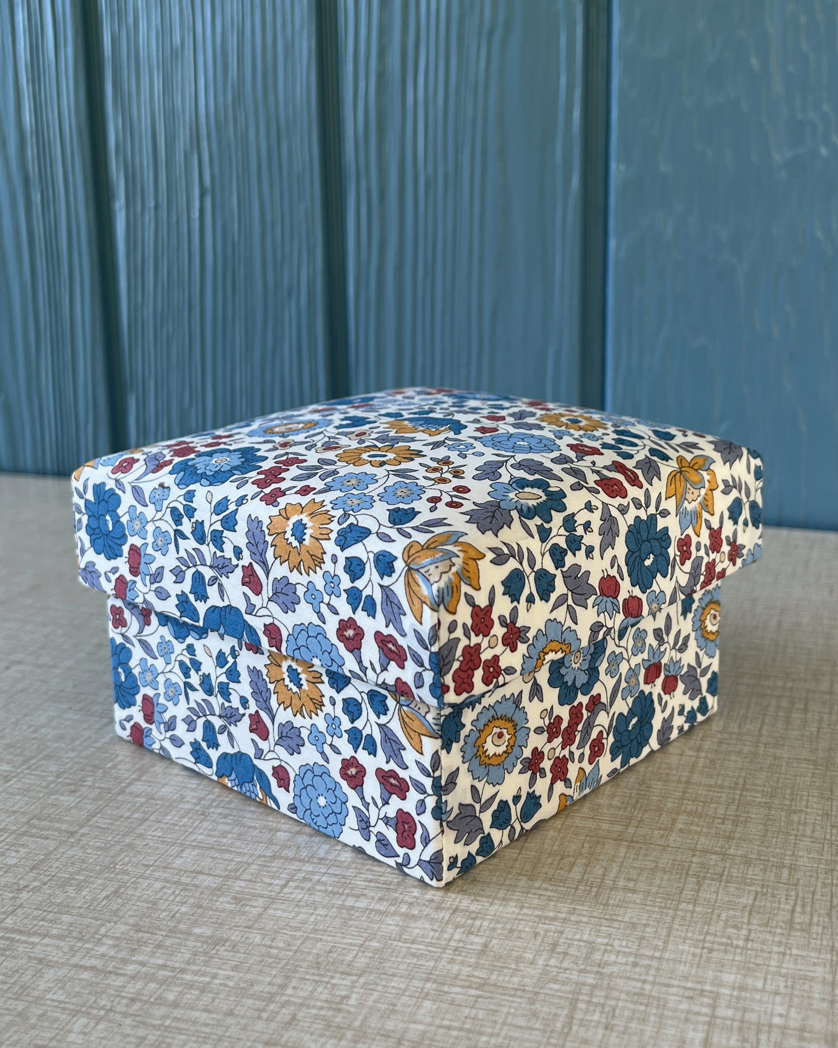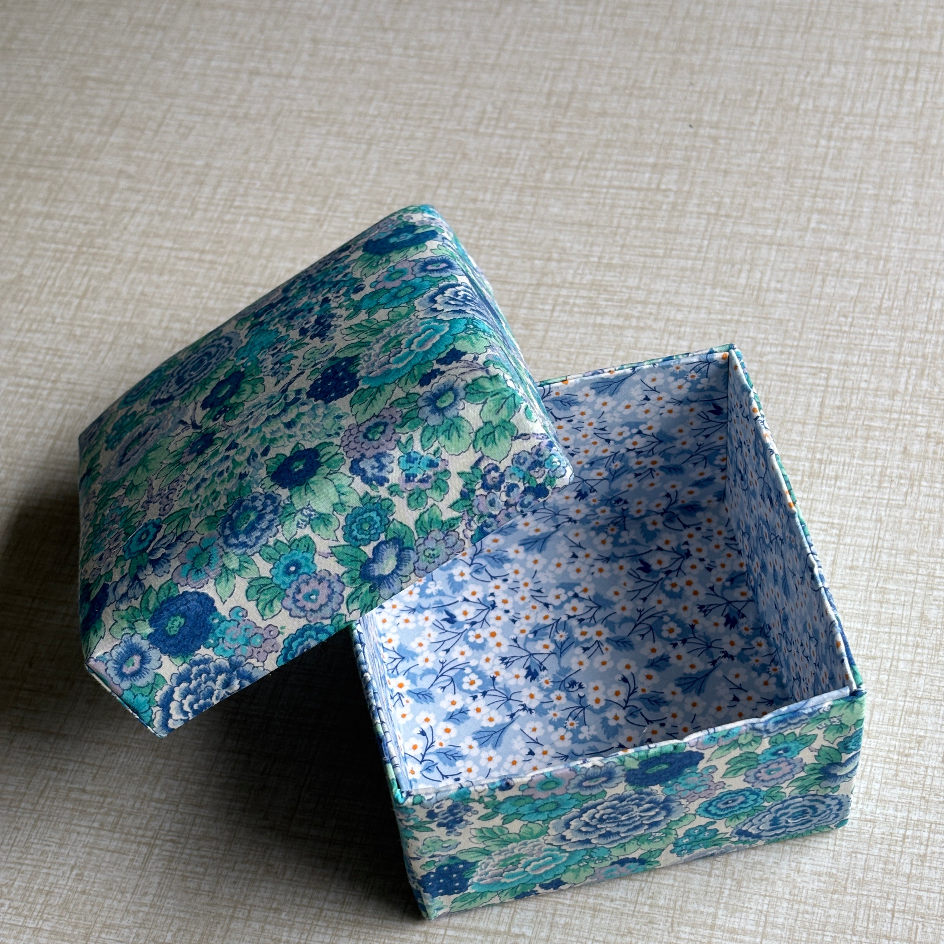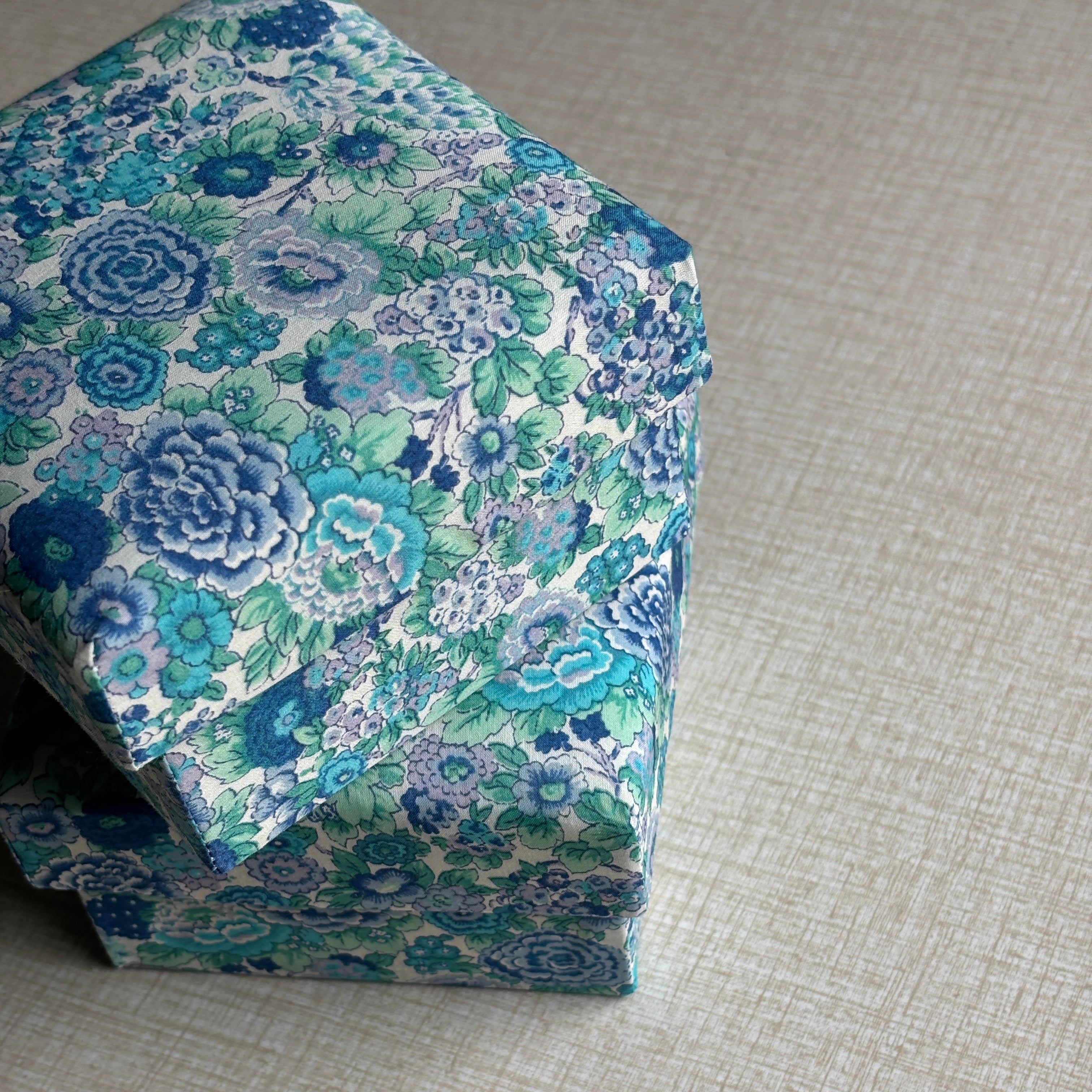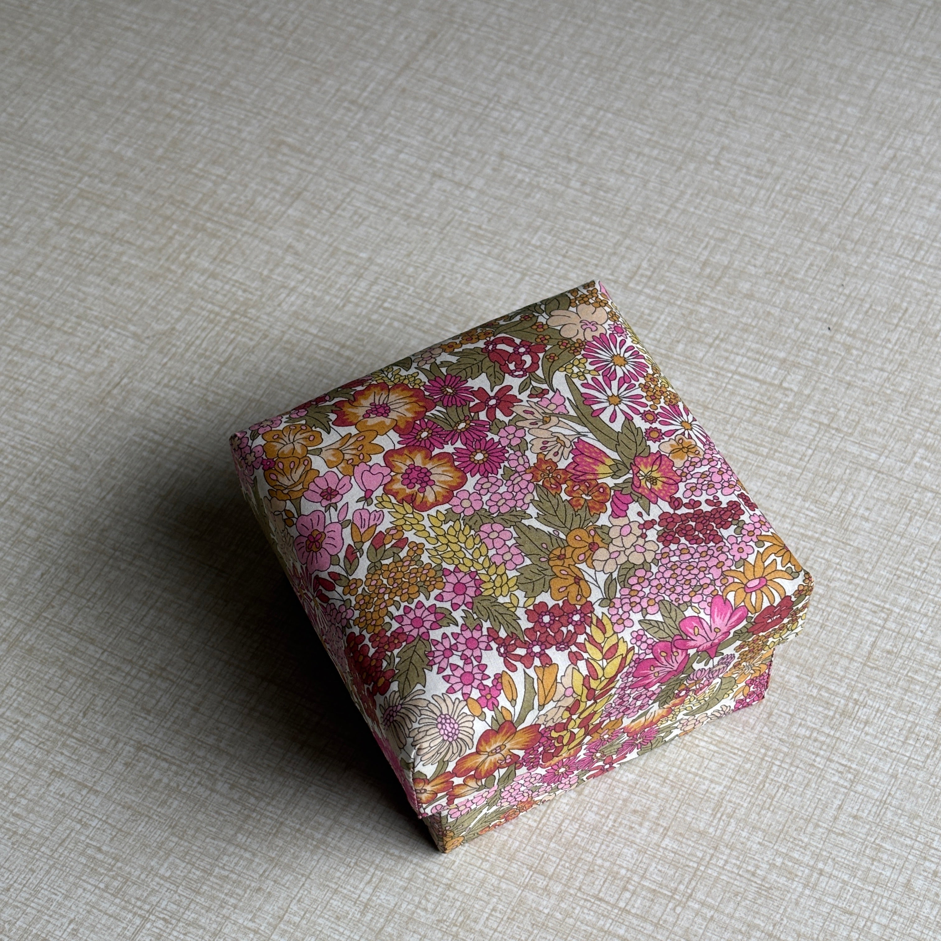 Stofæskerne, der er betrukket med originalt Liberty-stof, er små kunststykker i sig selv. Hver æske er omhyggeligt håndlavet og beklædt med de ikoniske Liberty-prints, som giver et elegant og tidløst udtryk. Æskerne er perfekte til smykker, små gaver, minder eller som en smuk detalje i indretningen.