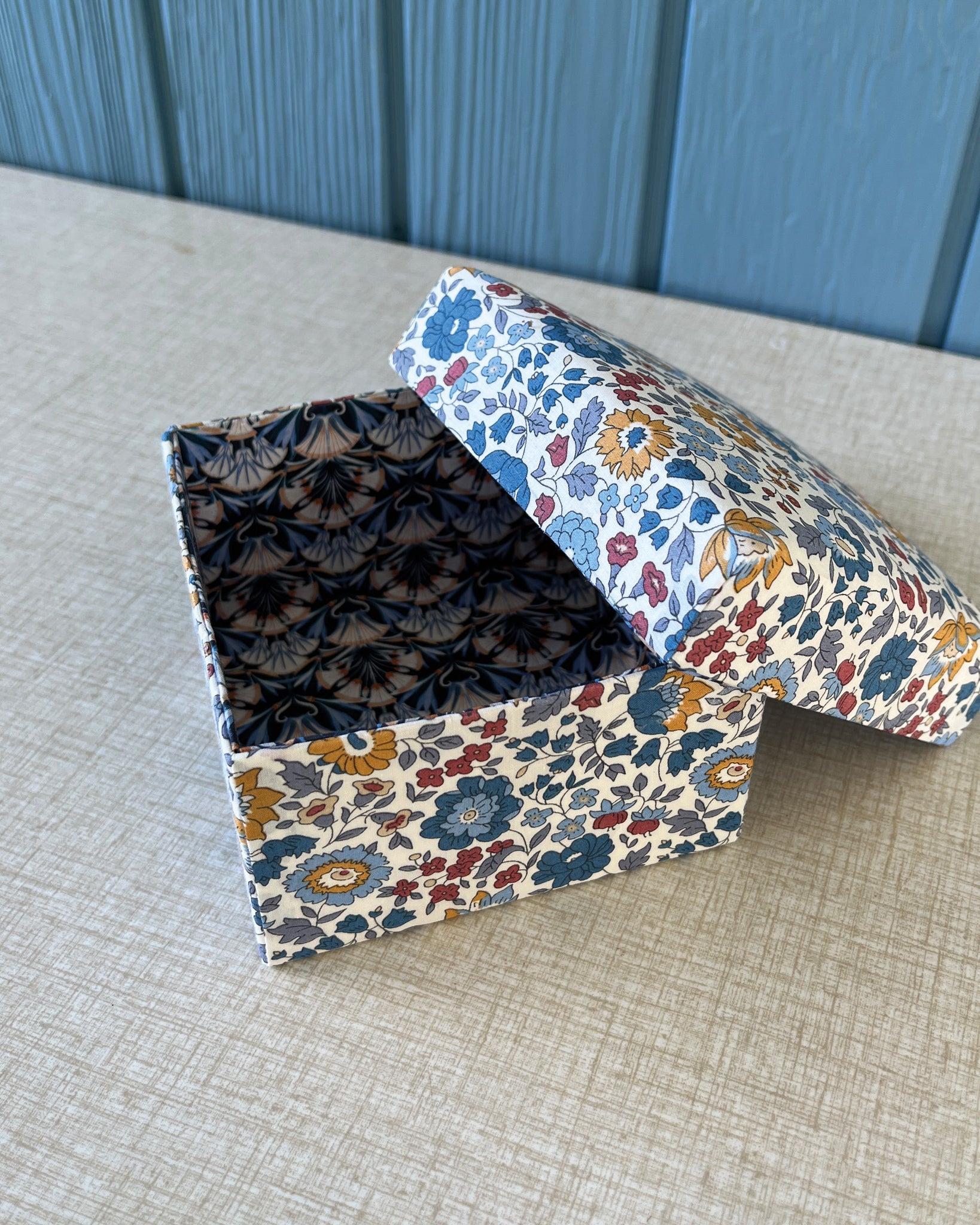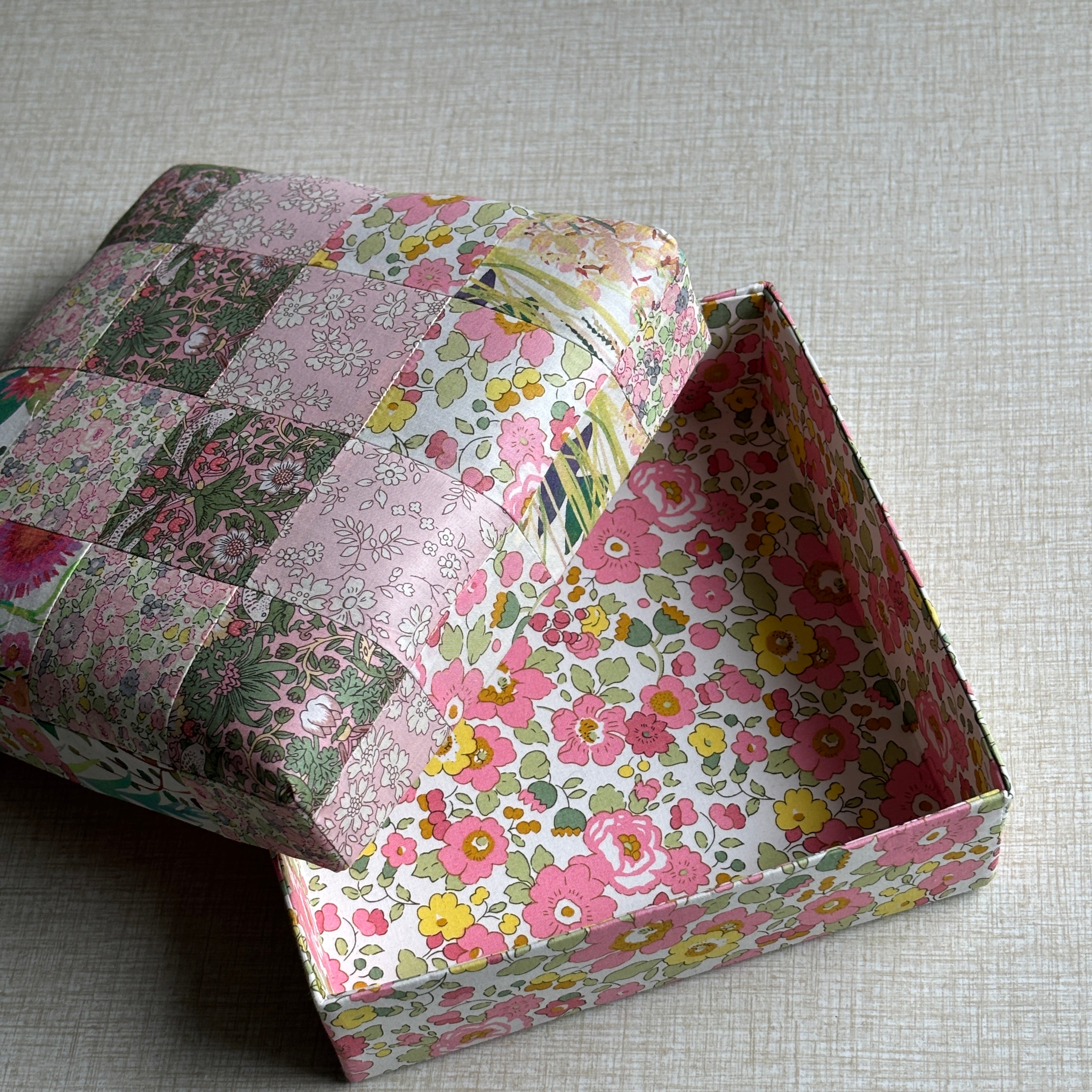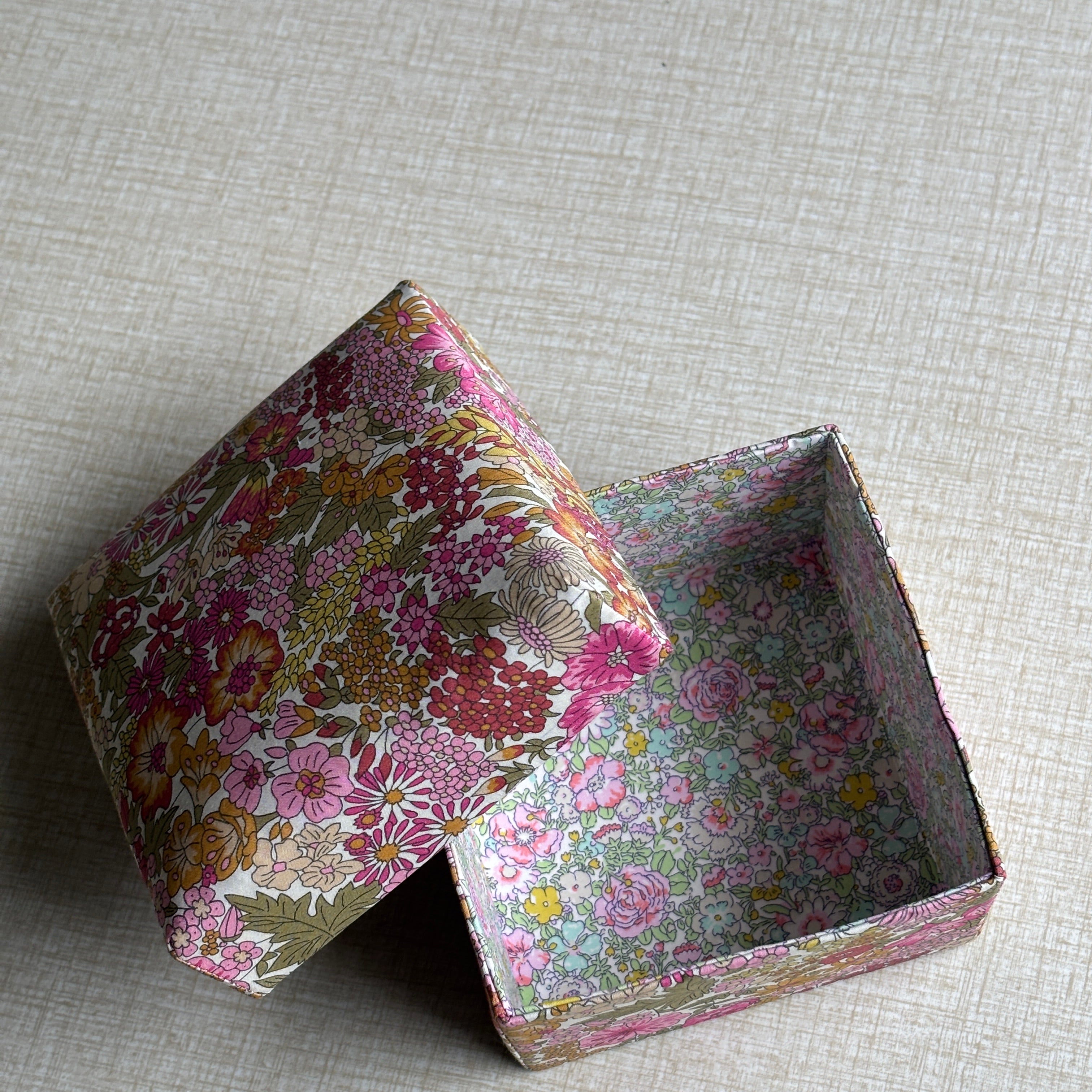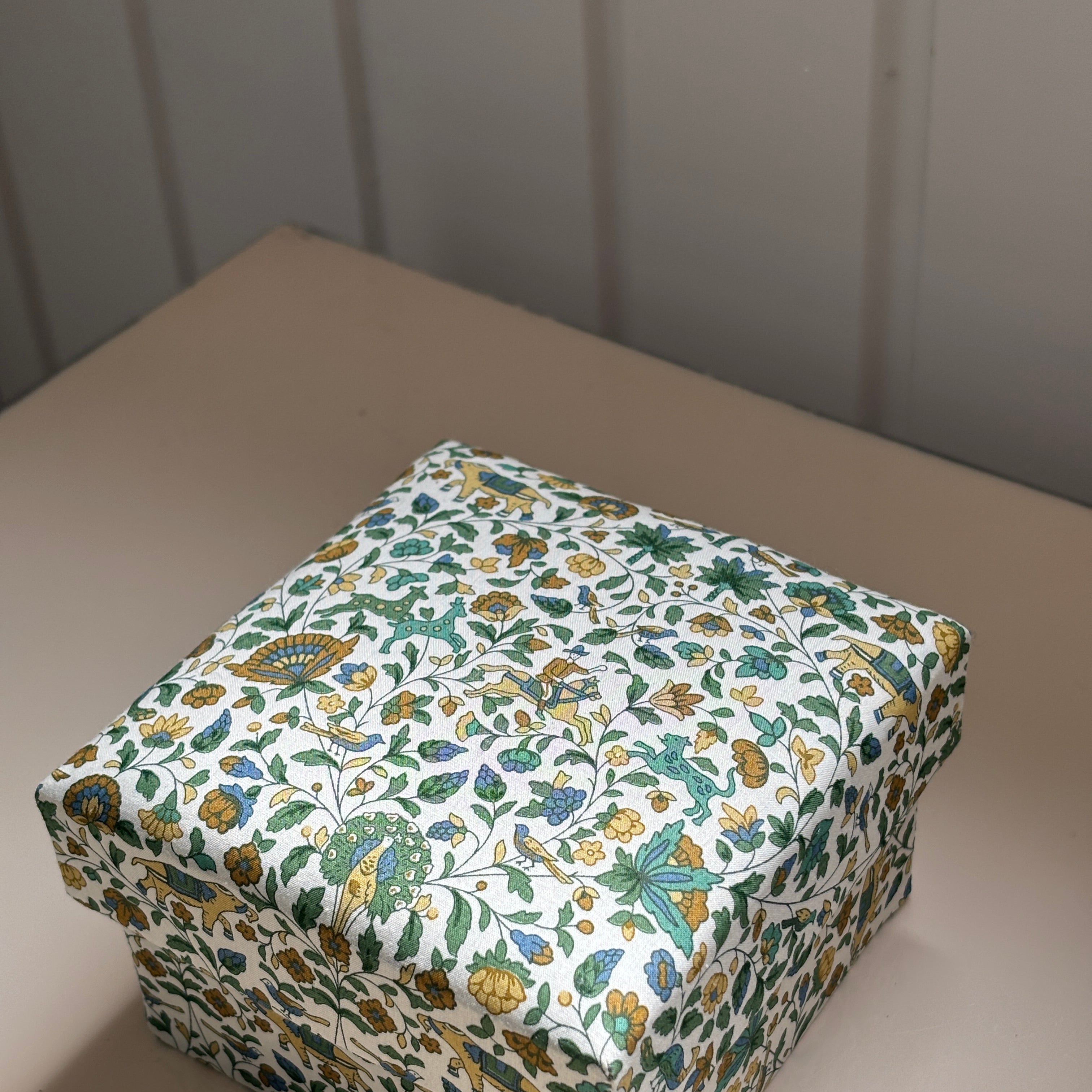Stofæskerne, der er betrukket med originalt Liberty-stof, er små kunststykker i sig selv. Hver æske er omhyggeligt håndlavet og beklædt med de ikoniske Liberty-prints, som giver et elegant og tidløst udtryk. Æskerne er perfekte til smykker, små gaver, minder eller som en smuk detalje i indretningen.