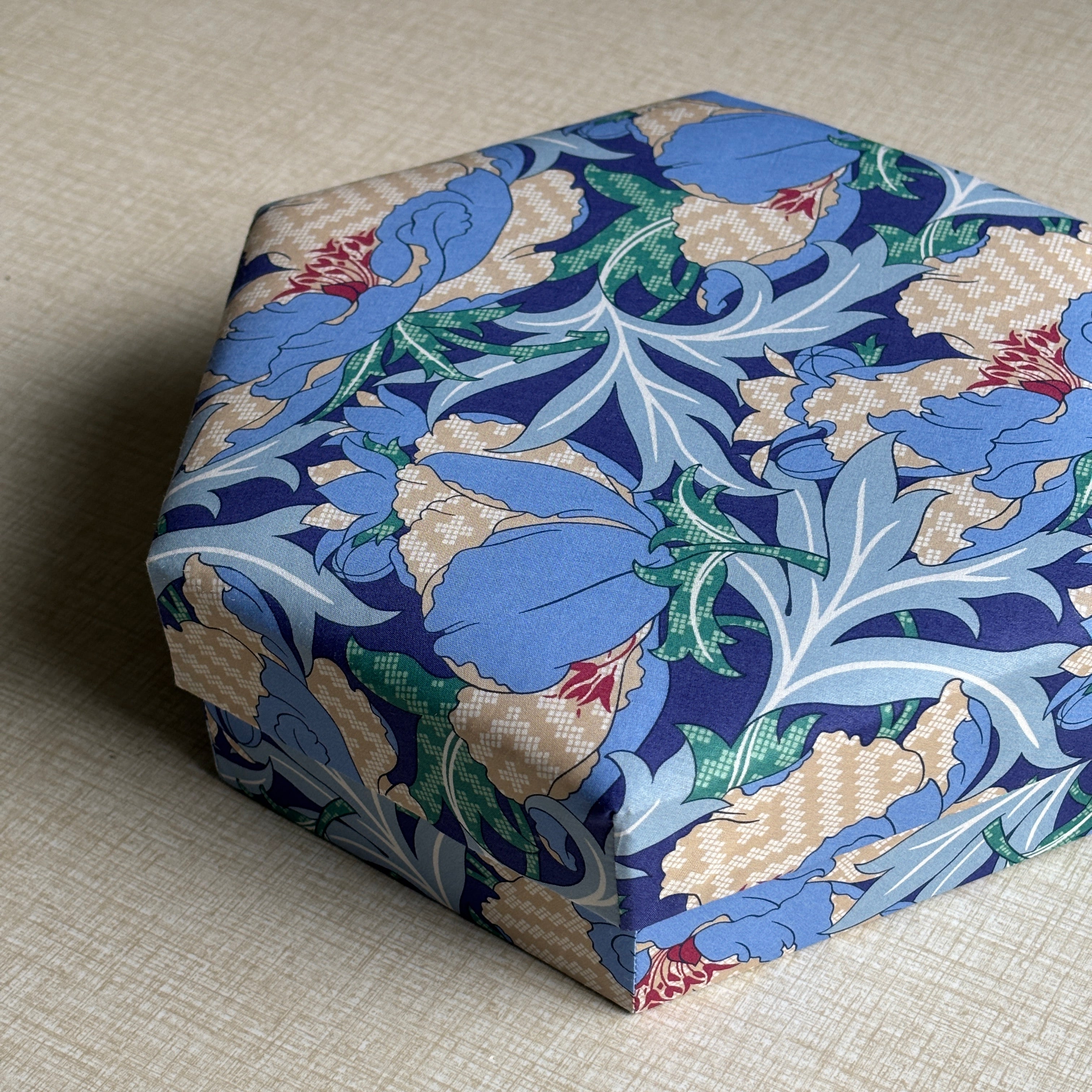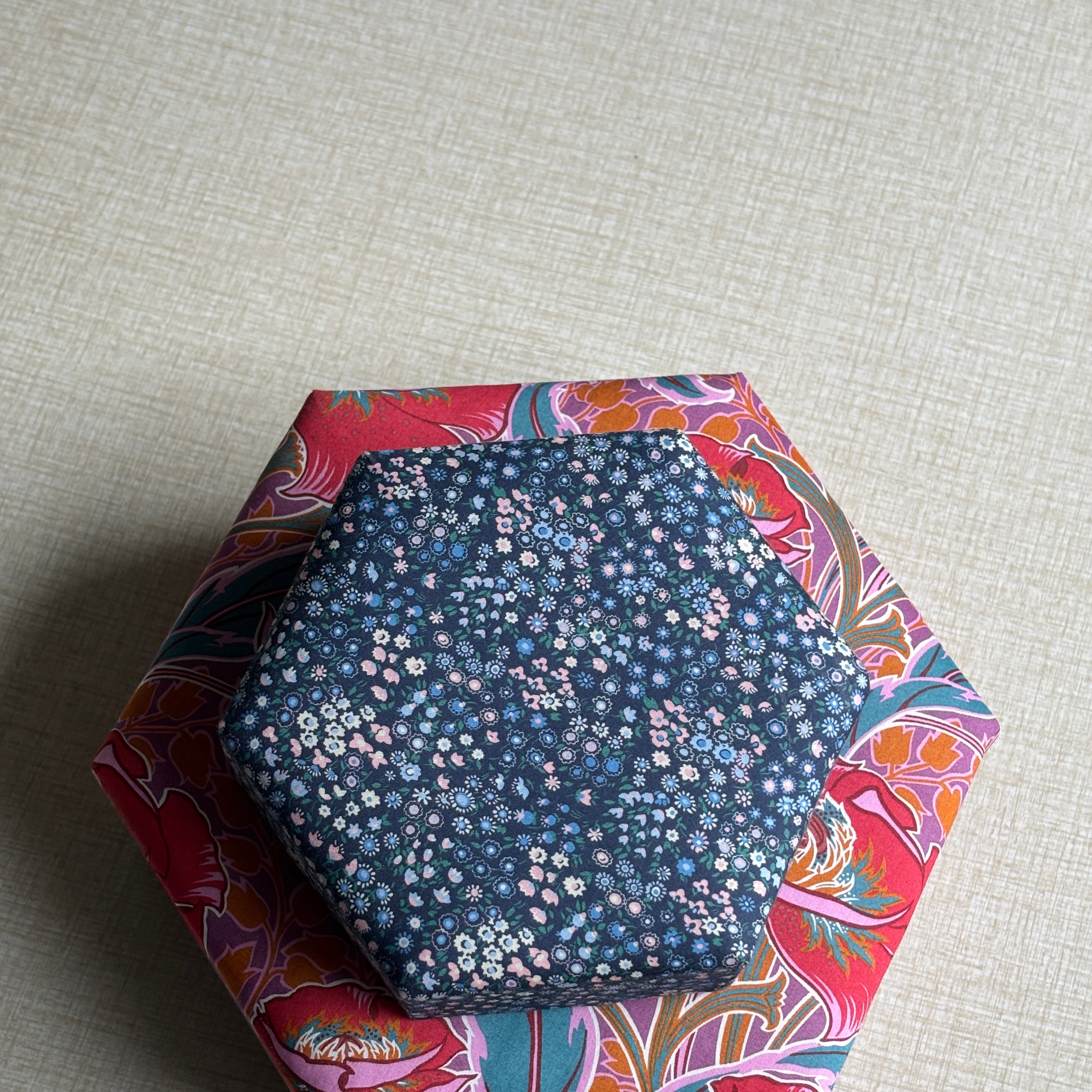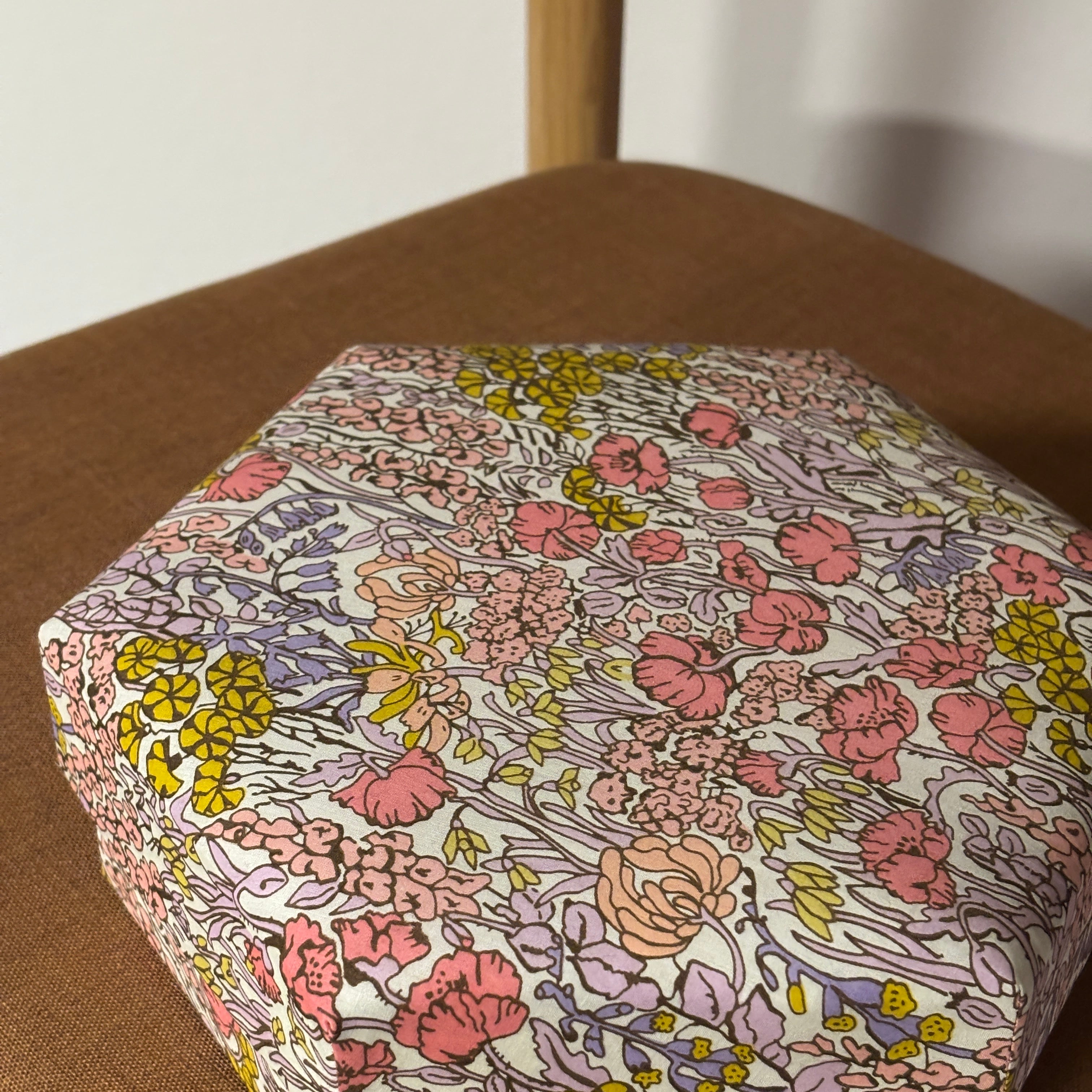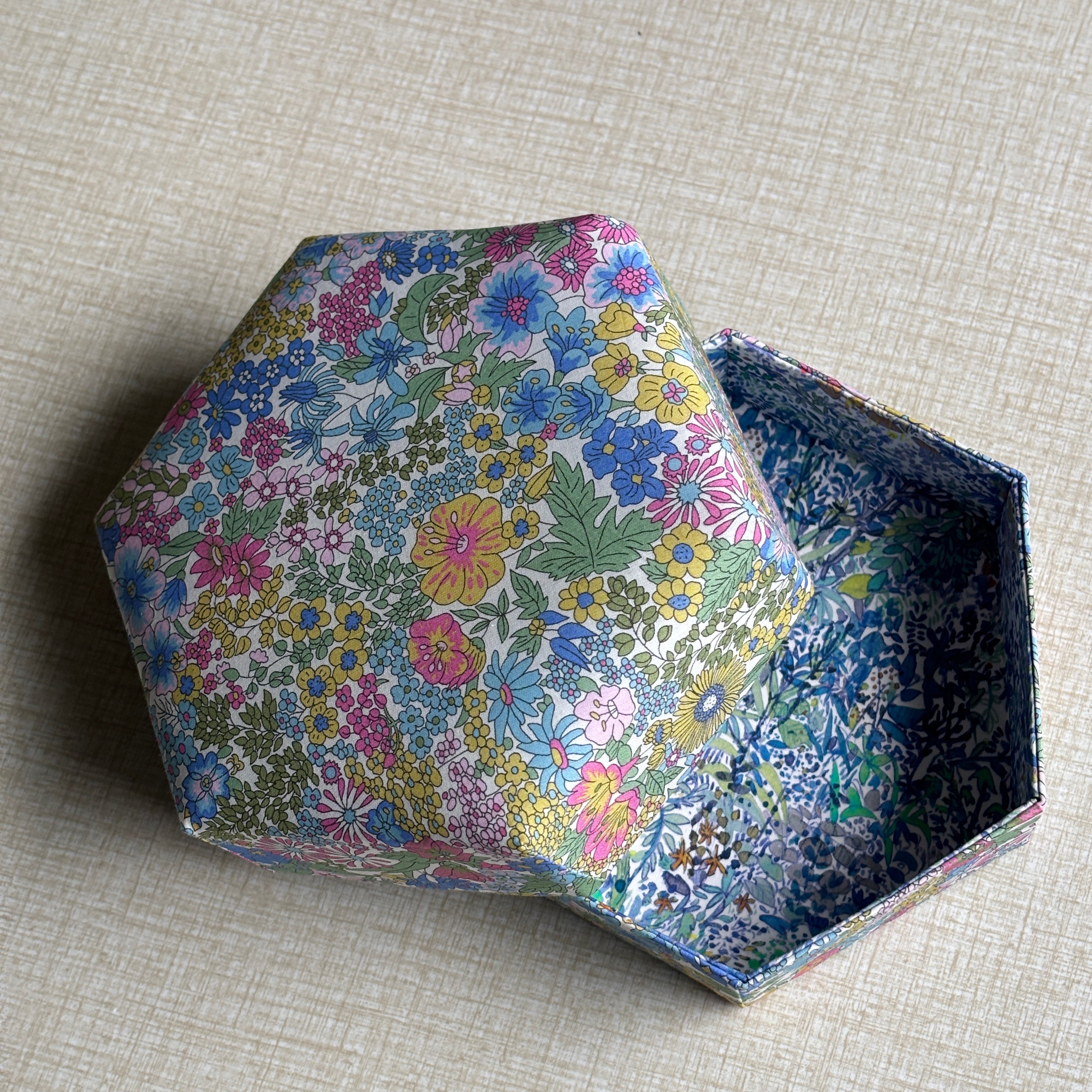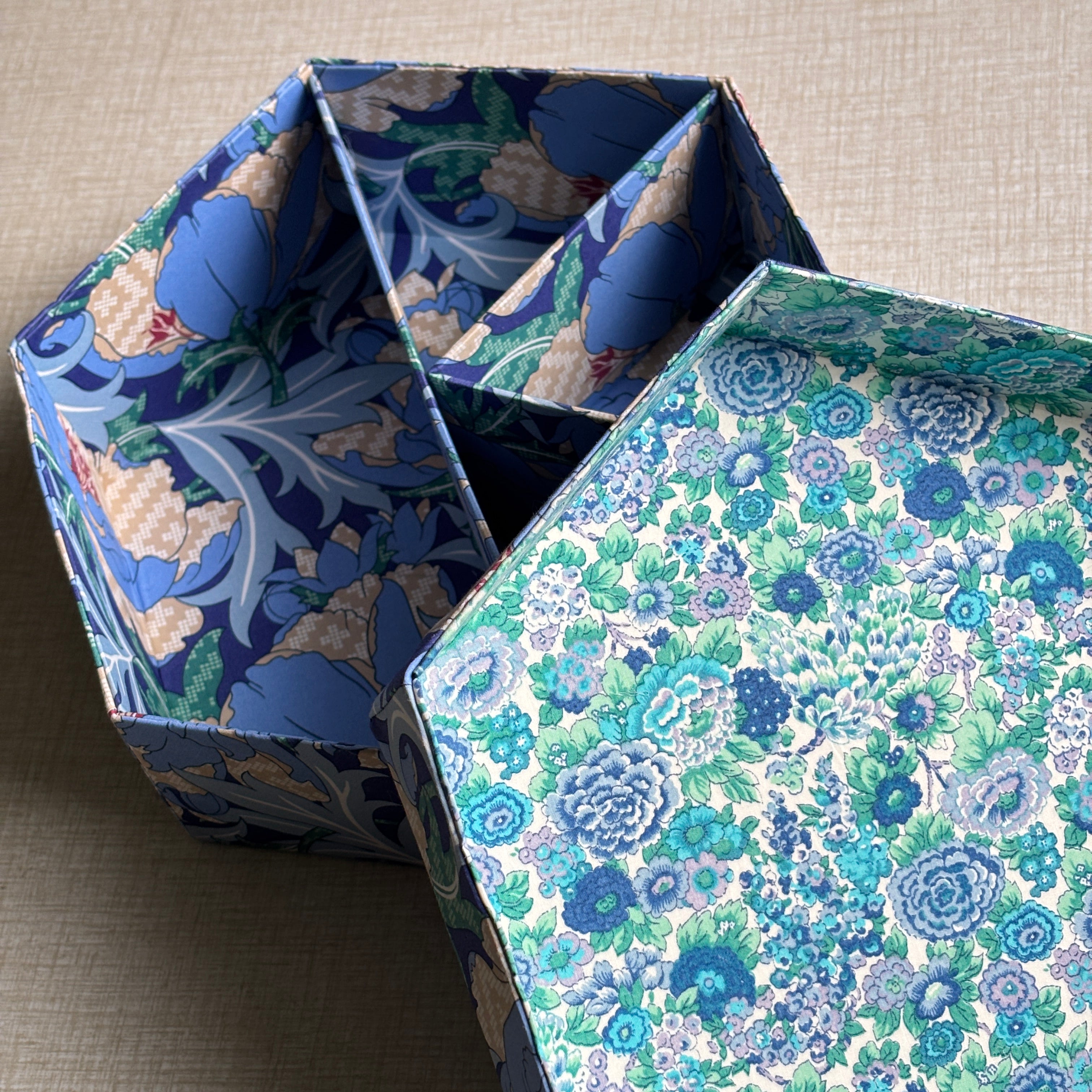 Stofæskerne, der er betrukket med originalt Liberty-stof, er små kunststykker i sig selv. Hver æske er omhyggeligt håndlavet og beklædt med de ikoniske Liberty-prints, som giver et elegant og tidløst udtryk. Æskerne er perfekte til smykker, små gaver, minder eller som en smuk detalje i indretningen.