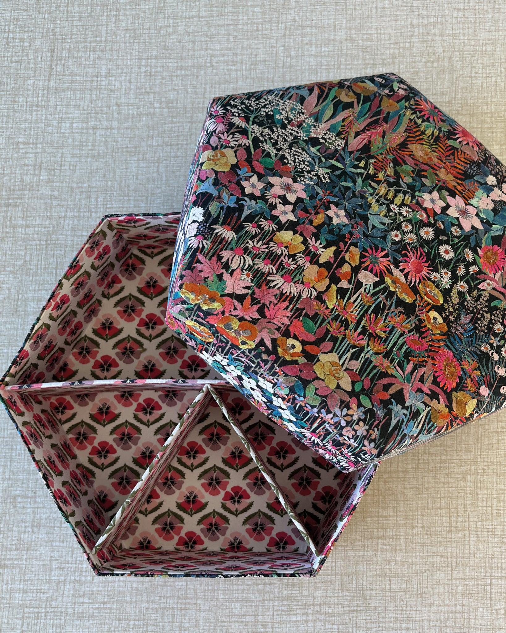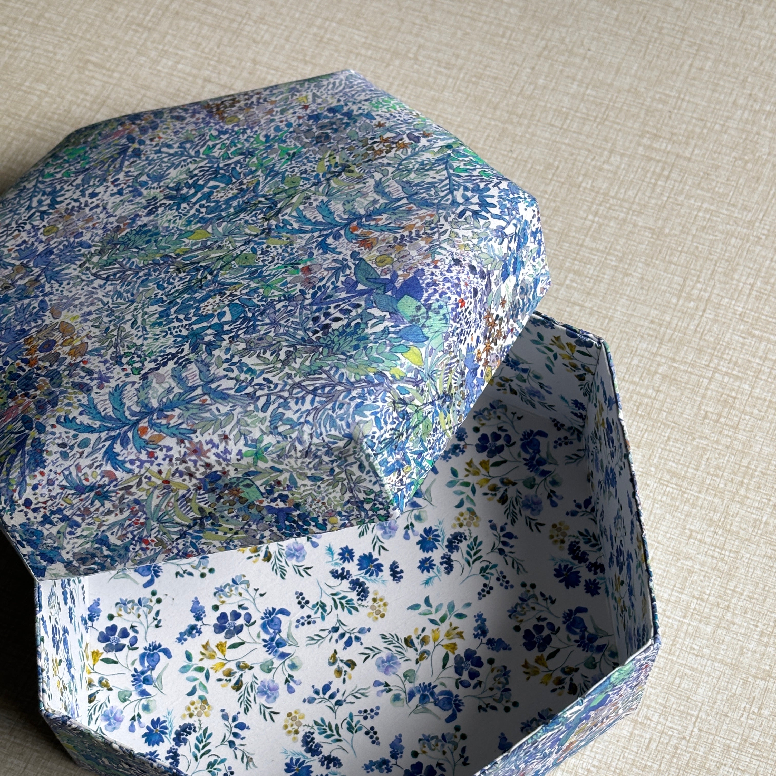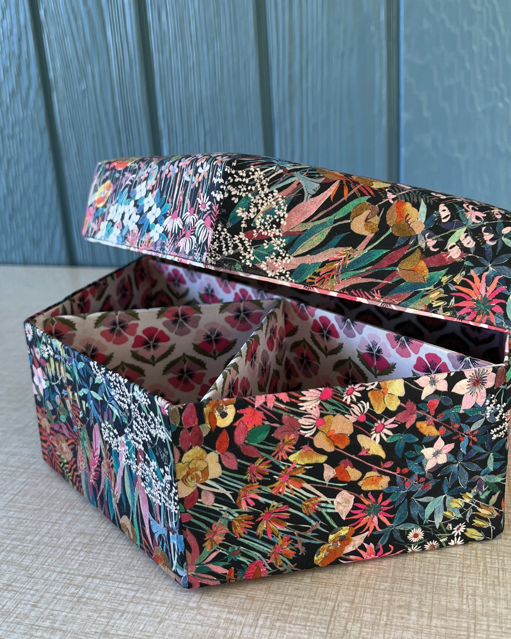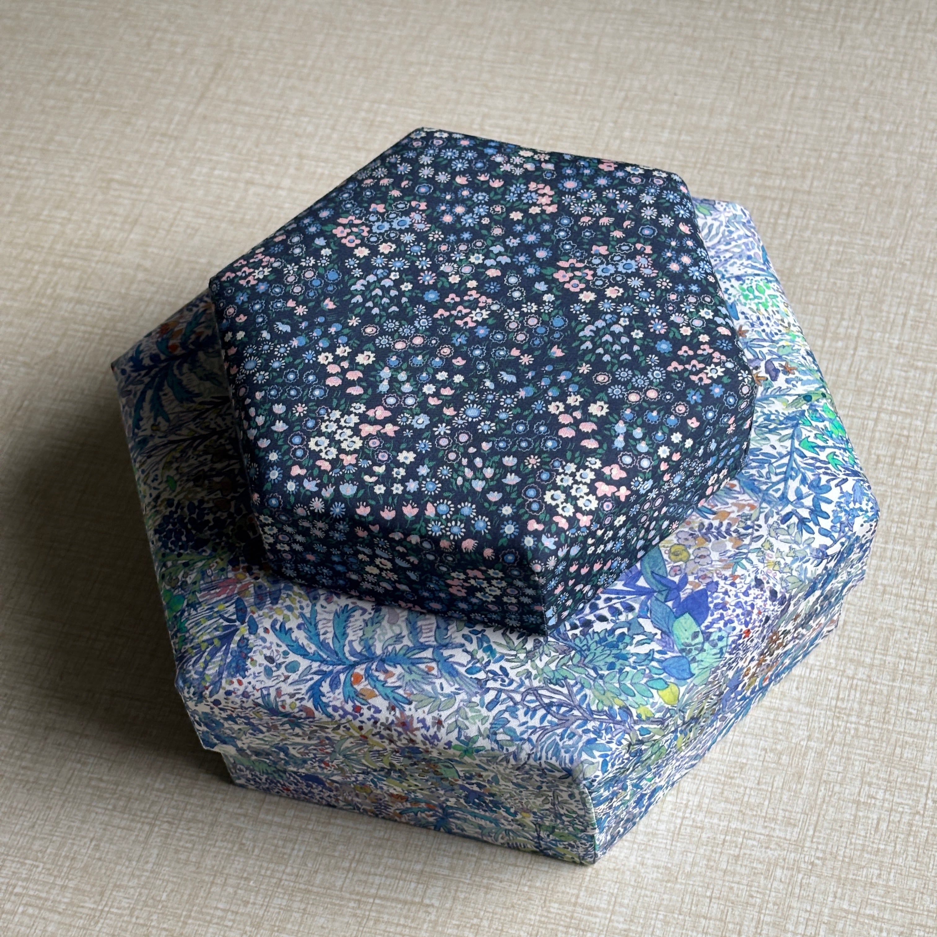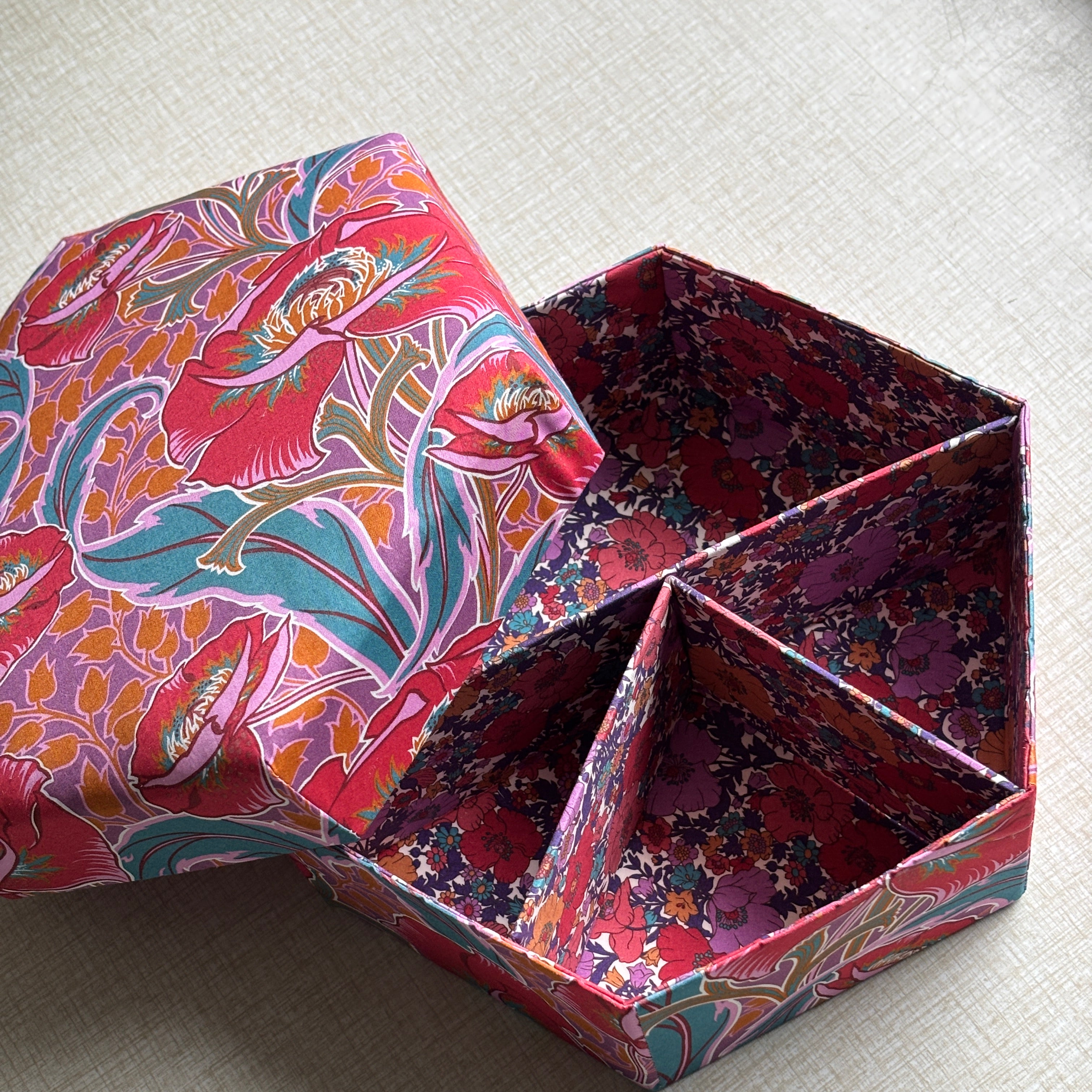 Stofæskerne, der er betrukket med originalt Liberty-stof, er små kunststykker i sig selv. Hver æske er omhyggeligt håndlavet og beklædt med de ikoniske Liberty-prints, som giver et elegant og tidløst udtryk. Æskerne er perfekte til smykker, små gaver, minder eller som en smuk detalje i indretningen.