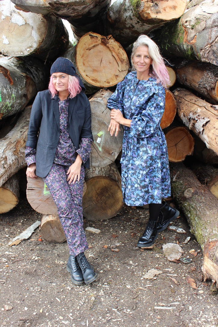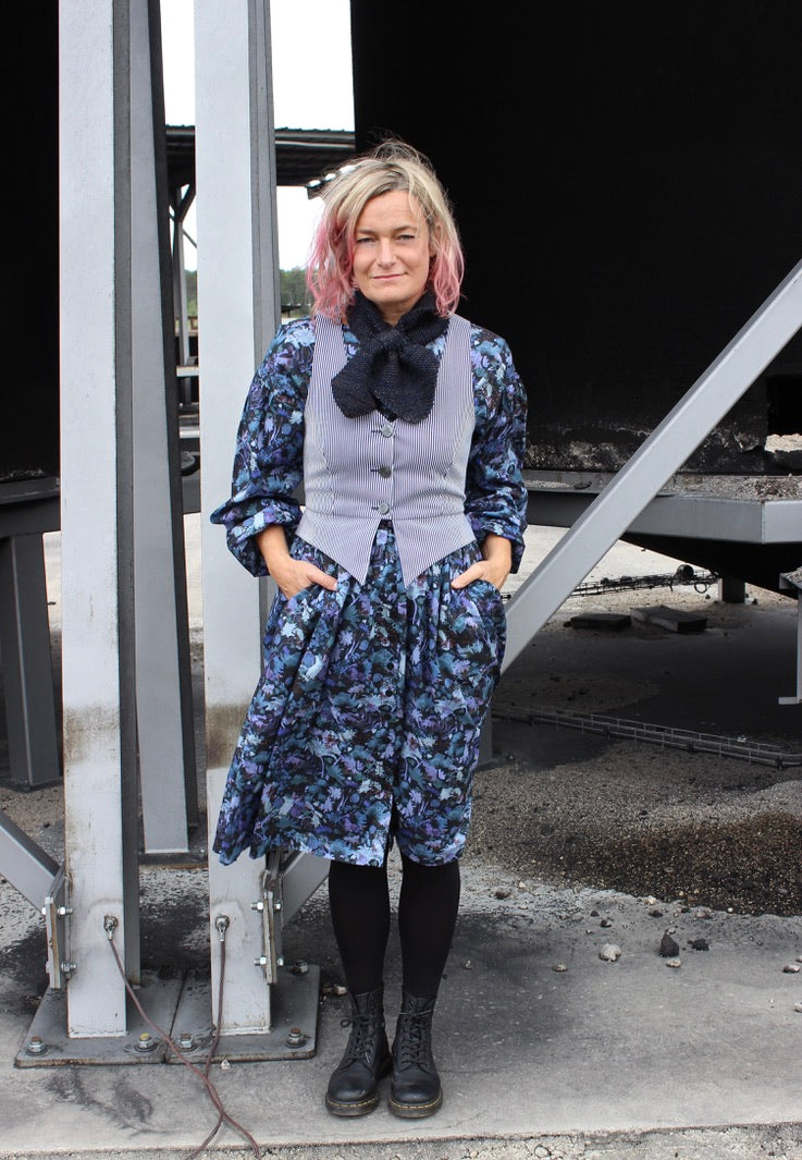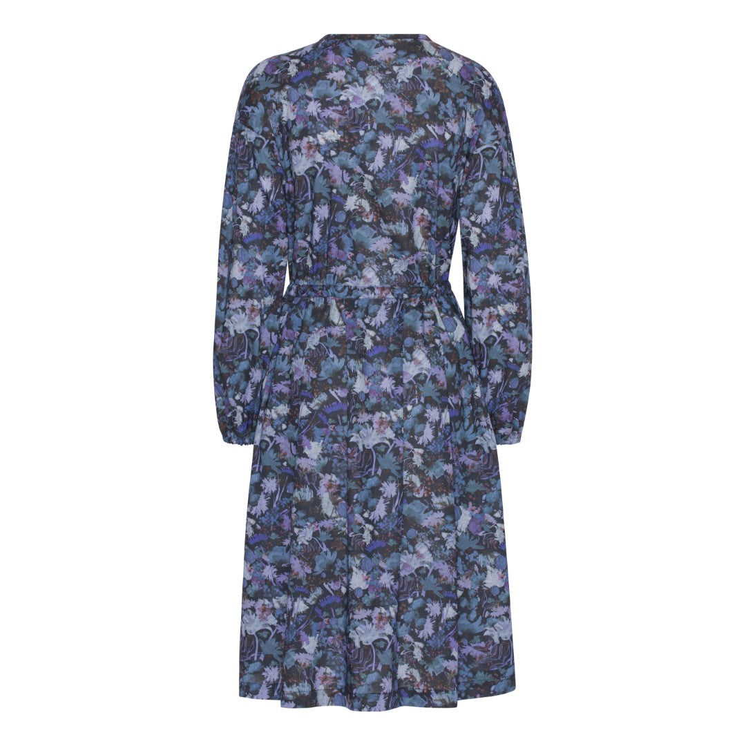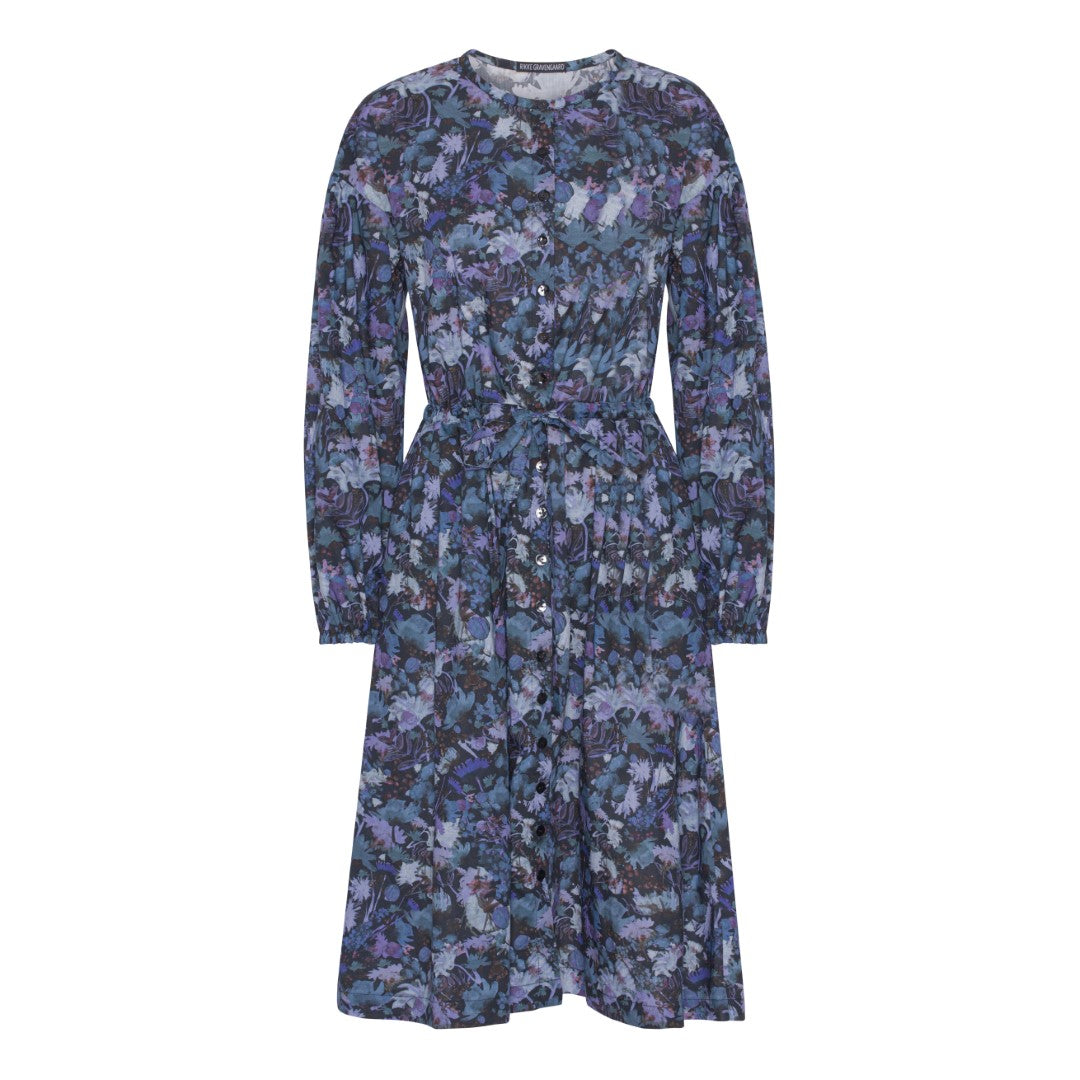 Manola kjole-Blå bomuld er syet i 100% bomuld i det smukkeste Liberty print. Der er perlemorsknapper ned foran, bindebånd i taljen og lommer i siden. Ærmerne har elastik ved håndled.