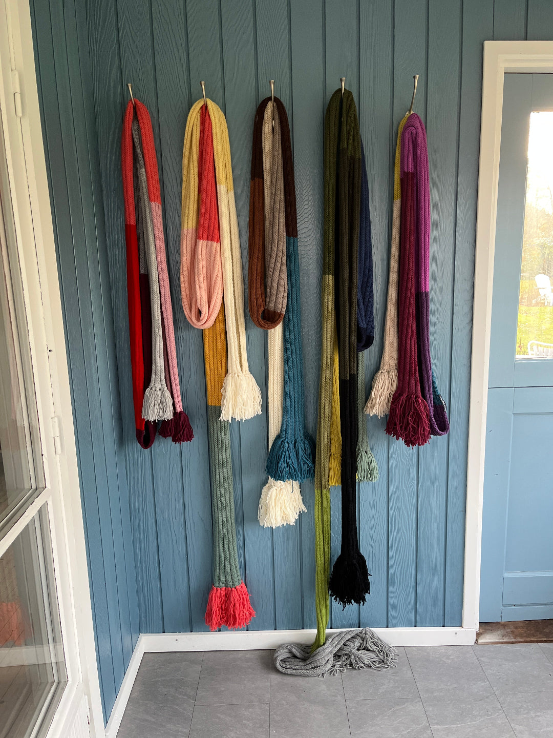 Dette skønne lange halstørklæde er lavet i 100% merinould. Det er håndstrikket og er super blødt. Det kan bruges både ude og indendørs i de kolde vinterdage.